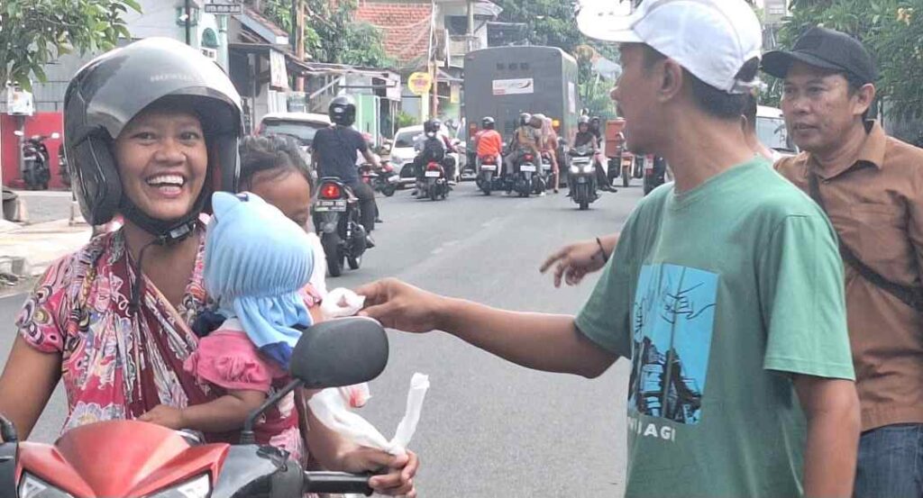 Mojokerto (Awalan.id) – Suasana hangat penuh senyum tampak di depan Kantor Sekretariat Persatuan Wartawan Indonesia (PWI) Mojokerto, Jalan Pekayon, Kecamatan Kranggan, Kota Mojokerto, Jumat (7/11/2025). Sejumlah pengguna jalan yang melintas tampak sumringah saat menerima pembagian nasi dalam kegiatan ‘Jumat Berkah’ yang digelar PWI Mojokerto.