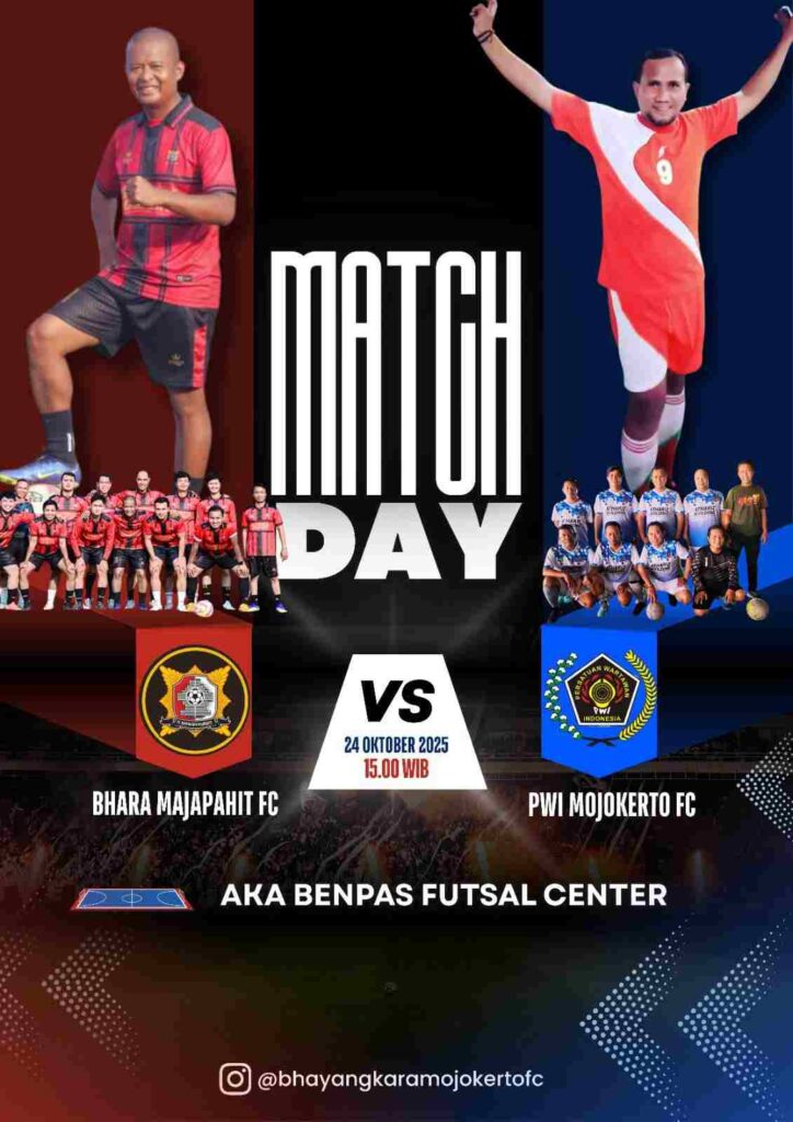 Mojokerto (Awalan.id) – Laga persahabatan bertajuk Match Day Futsal akan mempertemukan Tim Futsal PWI Mojokerto melawan Tim Bhara Majapahit FC pada, Jumat (24/10/2025) besok. Laga persahabatan akan digelar di Lapangan AKA Benpas Futsal, Kecamatan Magersari, Kota Mojokerto.