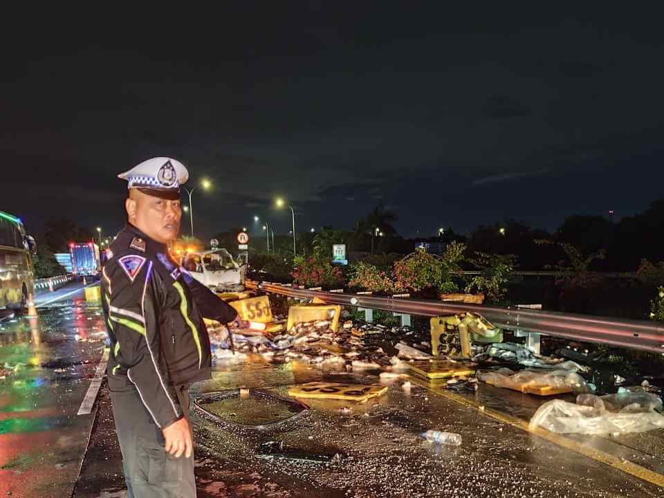 Satu orang mengalami luka ringan akibat insiden tersebut. Petugas tol bersama unit PJR kemudian mengevakuasi kendaraan dan membersihkan muatan ikan yang tercecer agar arus lalu-lintas kembali lancar. Kerugian materiil ditaksir mencapai Rp30 juta, sementara kerusakan sarana tol masih didata. Pengendara dihimbau untuk meningkatkan kewaspadaan.