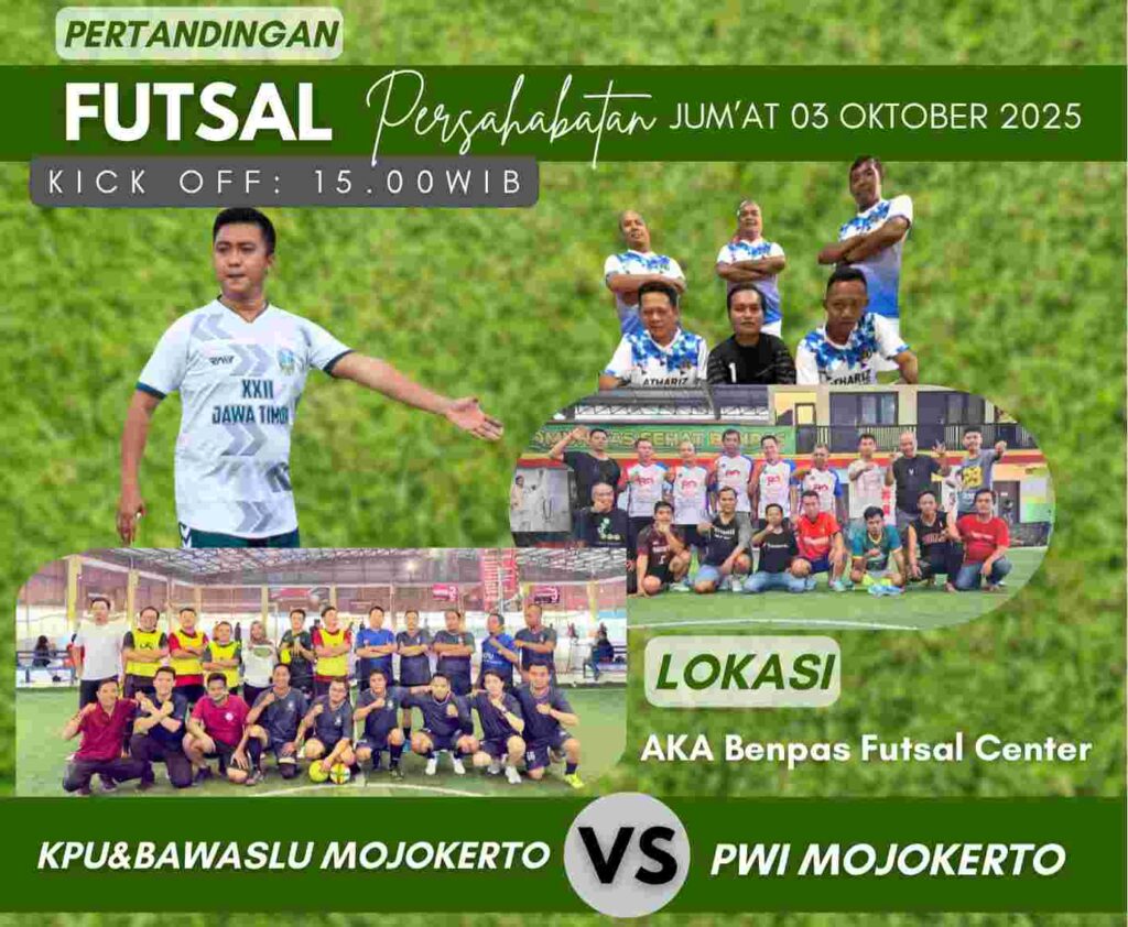Yakni Badan Pengawas Pemilu (Bawaslu) dan Komisi Pemilihan Umum (KPU) Kabupaten Mojokerto. Pertandingan persahabatan akan digelar di lapangan futsal indoor Benteng Pancasila, Kecamatan Magersari, Kota Mojokerto, Jumat (3/10/2025)